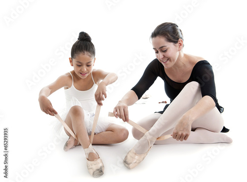 pretty young ballerina student & teacher tying up her dance shoe
