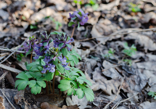 primroses in spring in a deciduous forest, flowers of a rye, gray, perennial herb, primroses in spring in a deciduous forest