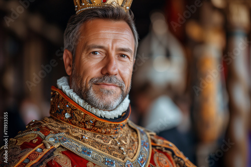 Prince Costume, King of the Carnival and Birthday Party, Mature and Graying Man Wearing a Crown, Luxurious and Wealthy, Representative of Medieval Power, Copy Space