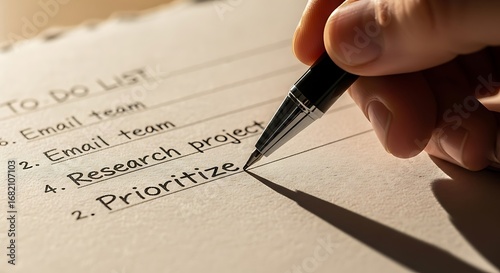 Prioritizing Task: An intimate perspective showcases a hand wielding a pen, meticulously documenting a to-do list on paper, capturing the very essence of focus and productivity.