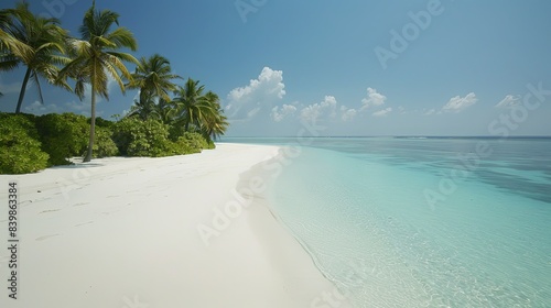 Pristine beach with turquoise waters and lush palm trees. Tropical paradise scene