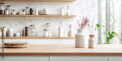 Product display on a white table in a blurred kitchen interior.
