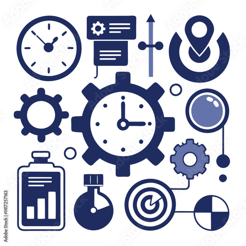 productivity, time management, icon, business, efficiency, clock, gear, target, growth, location, datum, setting, scheduling, progress, development, planning, organisation, strategy, goal, success, management, task, stopwatch, pointer, timing, process, presentation, marketing, teamwork, deadline, information, infographic, vector, symbol, flat, design, illustration