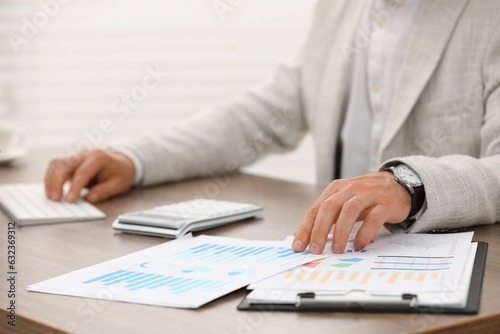 Professional accountant working at wooden desk in office, closeup