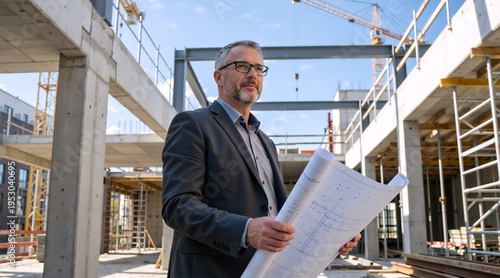 Professional architect holding blueprints at a construction site. Mature male engineer in a suit planning an urban development project. Architecture and civil engineering concept
