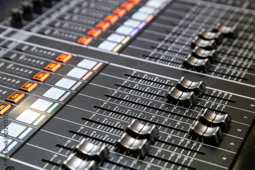 Professional audio mixer. Close up. Selective focus.