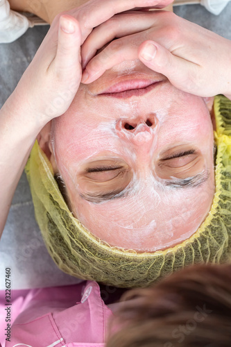 Professional beautician massaging with hands applies a cosmetic, relaxing mask to the face after chemical peeling.