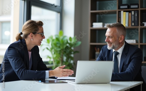 Professional business executive managers office team working using laptop computer sitting at table. Two middle aged colleagues company board discussing digital strategy at corporate meeting.