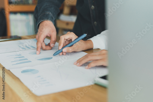 Professional businesswoman and man consulting, working on documents at corporate office. Hands pointing chart paperwork. Team discussion report project finance, planing marketing, statistic analysis