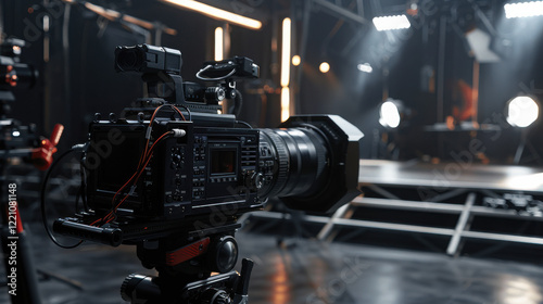 Professional Camera Setup in a Studio with Dramatic Lighting for Film or Video Production.