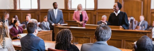 Professional Courtroom Trial Scene with African American Attorney and Female Judge Presiding Premium Legal Team Content for Advocacy and Justice Marketing