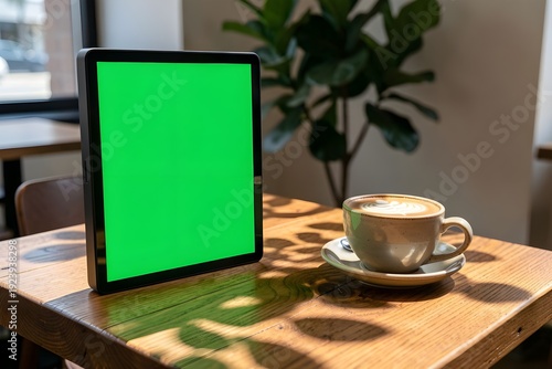 Professional digital tablet with green screen and cup of coffee on a wooden table in a sunny cafe.