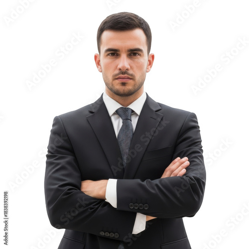 Professional man in a dark suit and tie with arms crossed looking directly forward isolated on transparent background