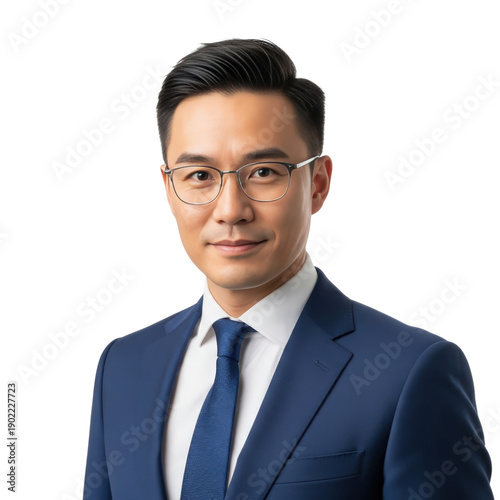 Professional man in a suit posing for a corporate portrait with a neutral expression isolated on transparent background