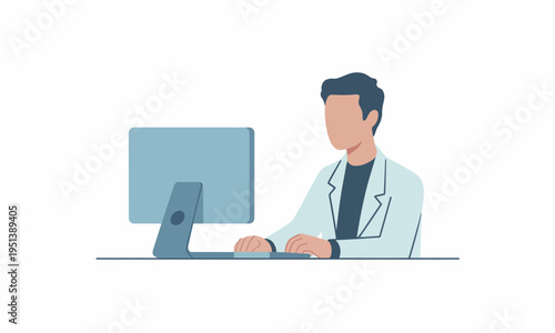 man, computer, working, office, desk, illustration, vector, professional, business, flat, minimalist, person, typing, technology, workspace, work, laboratory, scientist, doctor, researcher, corporate, employee, digital, modern, communication, productivity, design, character, career, occupation, job, male, lifestyle, cyberspace, software, programmer, developer, information, research, education, learning, online, virtual, keyboard, monitor, clean, isolated, faceless