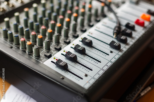 professional music mixer, macro photo music remote control, professional sound. Technical progress in music. Film texture Unfocused