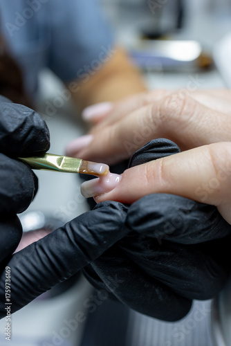 Professional nail technician performing manicure process in beauty salon