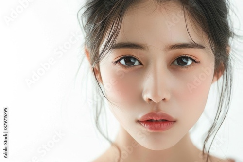 Professional photograph of a young woman with flawless skin, looking refreshed and natural, isolated on white background,, asia,china