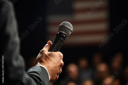 Professional Speaker Holding Microphone in Front of an Audience with American Flag in Background,