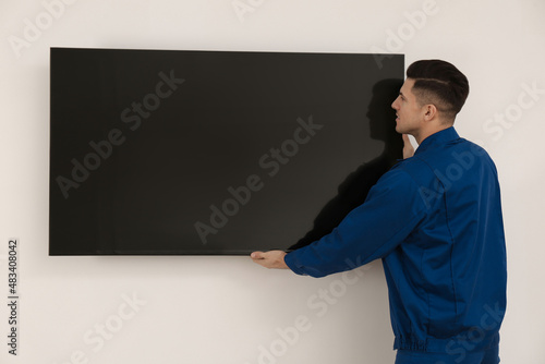 Professional technician installing modern flat screen TV on wall indoors