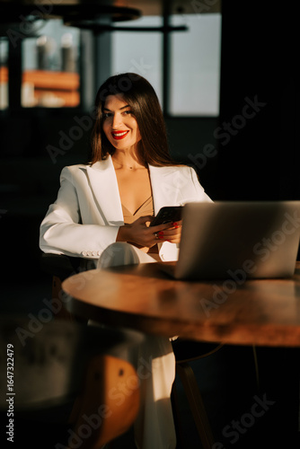 business, woman, laptop, smartphone, office, work, modern, technology, professional, confident, daylight, stylish, communication, sitting, casual attire, clothing, interior, portrait, lifestyle, manager, productivity, fashion, creative, thinking, typing, successful, design, workspace, female, entrepreneur, chatting, connection, bright, cheerful, smart, elegant, contemporary, warm, networking, leader, ambience, businesswoman, interaction, innovation, sharpened, engagement, professionalism