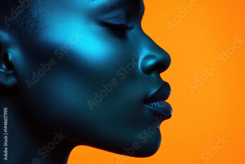 profile, elegant, african, american, woman, closed, eye, blue, light, orange, background, beauty, serenity, modern, studio, setting, face, skin, texture, detail, fashion, style, cosmetic, make-up, glossy, lip, nose, ear, hair, short, clean, smooth, dark, tone, colours, vibrant, contrast, artistic, creative, portrait, model, pose, sensual, calm, peaceful, quiet, serene, sleek, chic