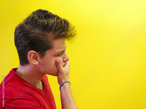 caucasian, man, yellow, copy space, red shirt, guy, young, hiding, sad, shirt, white, photogenic, portrait, man, studio, adult, male, expression, casual attire, emotion, cephalalgia, shame, ashamed, attractive, human, feeling, people, person, background, face, 1, posing, model, looking, head, depressed, crying, sorrowful, grieved, isolated, concept, beautiful