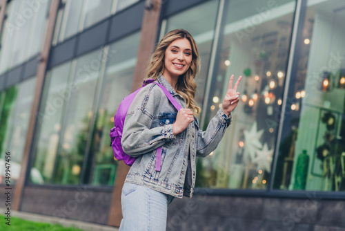 Profile photo of nice young woman carry backpack show v-sign wear denim jacket walk city center outdoors