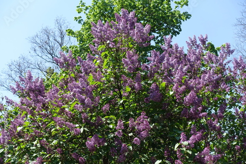 Profusion of purple flowers of Syringa vulgaris against blue sky in mid May
