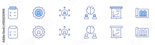 Project icon set in two styles, Duotone and Thin Line style. Editable stroke. brain, data analysis, file, clipboard, human resources, outsourcing