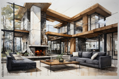 draft, architecture, interior, living room, dining room, watercolor, draft, design, drawing, chimney, sofa, couch, furniture, veranda, picture window, floor, mezzanine, modern, design, bright, space, glassed in