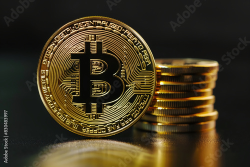 Prominent golden Bitcoin gleaming against dark reflective surface background