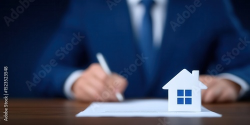property loan mortgage qualification home concept. Person signing a document with a miniature house model in focus.