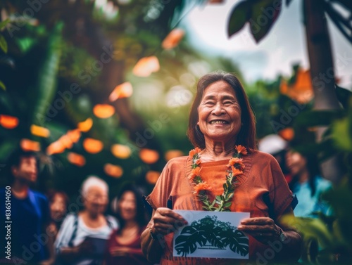 citizenship, celebration, senior, east, asian, woman, garden, community, diversity, neighboring, morning, greenery, joyful, outdoors, certificate, pride, achievement, multicultural, integration, social, event, emigration, daylight, elderly, happiness, gathering, festivity, mature, portrait, party, blouse, orange, vibrant, candid, real, people, foliage, togetherness, oneness, nature, lifestyle, friendly, smile, contentment