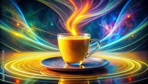 Psychedelic coffee cup with swirling neon energy, futuristic beverage concept