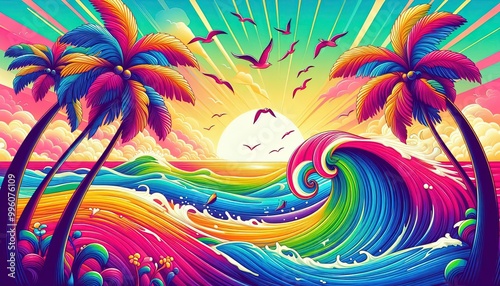 hallucinogen, ocean, sunset, palm tree, tropical, beach, wave, abstract, colourful, vibrant, art, illustration, digital artwork, graphic design, summer, vacation, paradise, nature, sea, sky, bird, sun, horizon, palm leaf, bright, fantasy, whimsical, surreal, dreamlike, mood, feeling, emotion, graphic, design, pattern