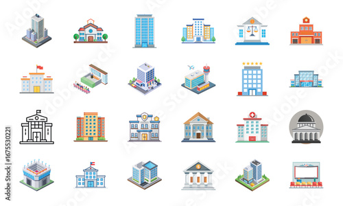 Public and Government Building Icons Set – Bank, Hospital, School, University, Courthouse, Police Station, Office Building, Airport, Stadium, Theater, Modern Business Tower, Government Institution, Fi