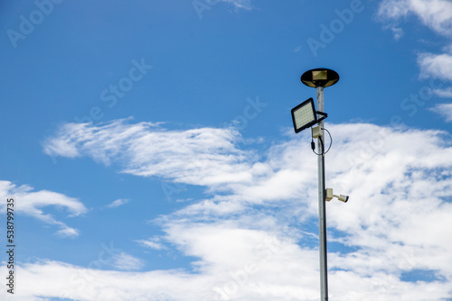 Public city light with solar panel powered on blue sky with clouds
