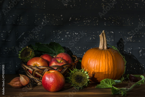 autumn, pumpkin, apple, seasonal, fruit, basket, colourful, harvest, orange, fall, decoration, dark, food, red, still, fresh, healthy, freshness, gold, wicker, gourd, sweet, agriculture, vegetable, delicious, gold, decorative, bright, selective, symbol, dessert, organic, crop, pattern, purple, plant, garden, yellow, ingredient, diet, ripe, produce, wall