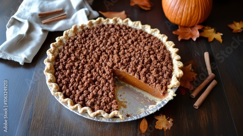 Pumpkin Pie: A full pumpkin pie with a few slices removed, revealing a rich, creamy texture.