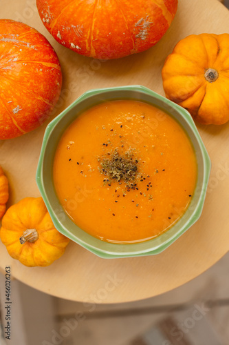 pumpkin soup in a bowl with pumpkins flat lay