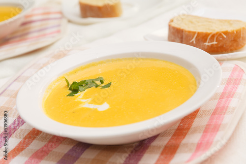 Pumpkin soup in white bowl