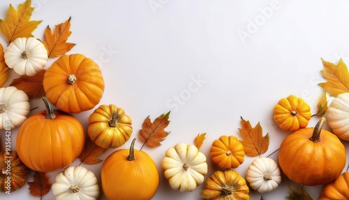 pumpkins and yellow autumn leaves on corner on a white background. autumn harvest concept. pumpkin day festival