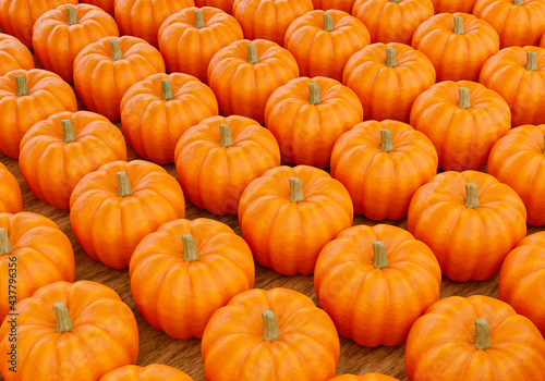 Pumpkins background. Texture with orange pumpkins. Pumpkins background for holiday halloween. Orange pumpkin pattern for site. Jack O'Lantern carving pumpkin illustration. 3d rendering gourds.