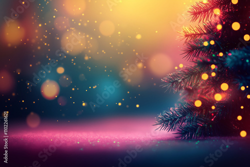 Purple Christmas magic background with pine, bokeh effect and space for text