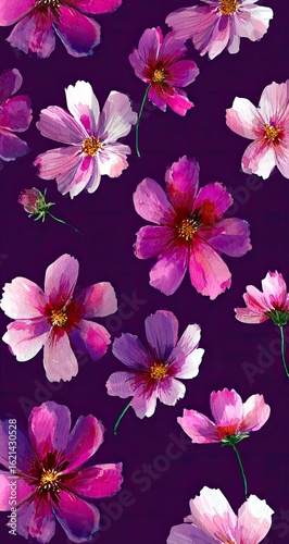 cosmos, flower, watercolor, purple, vertical, design, fabric, print, floral, pattern, pink, bloom, blossom, botany, background, texture, art, nature, garden, spring, summer, beauty, elegant, romantic, delicate, soft, high-coloured, colourful, illustration, painting, graphic, textile, wallpaper, card, poster, decoration, style, image, pretty, artistic, flower, plant