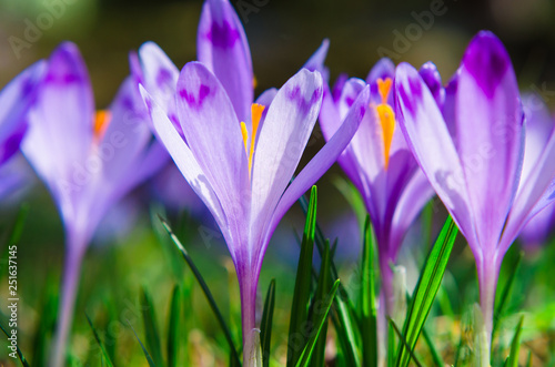 Purple flower in nature. Beautiful crocus flowers during spring. Selective focus.