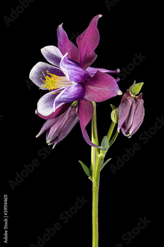 Purple flower of aquilegia, blossom of catchment closeup, isolated on black background