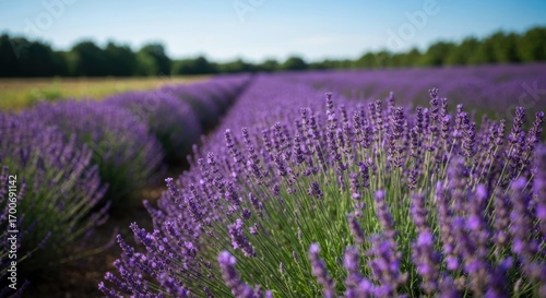 Purple lavender field stretches to horizon