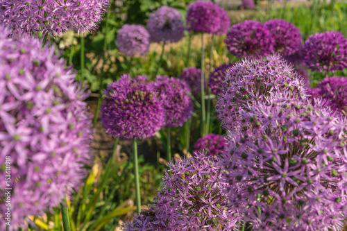 Purple round flowers of giant onion in the garden